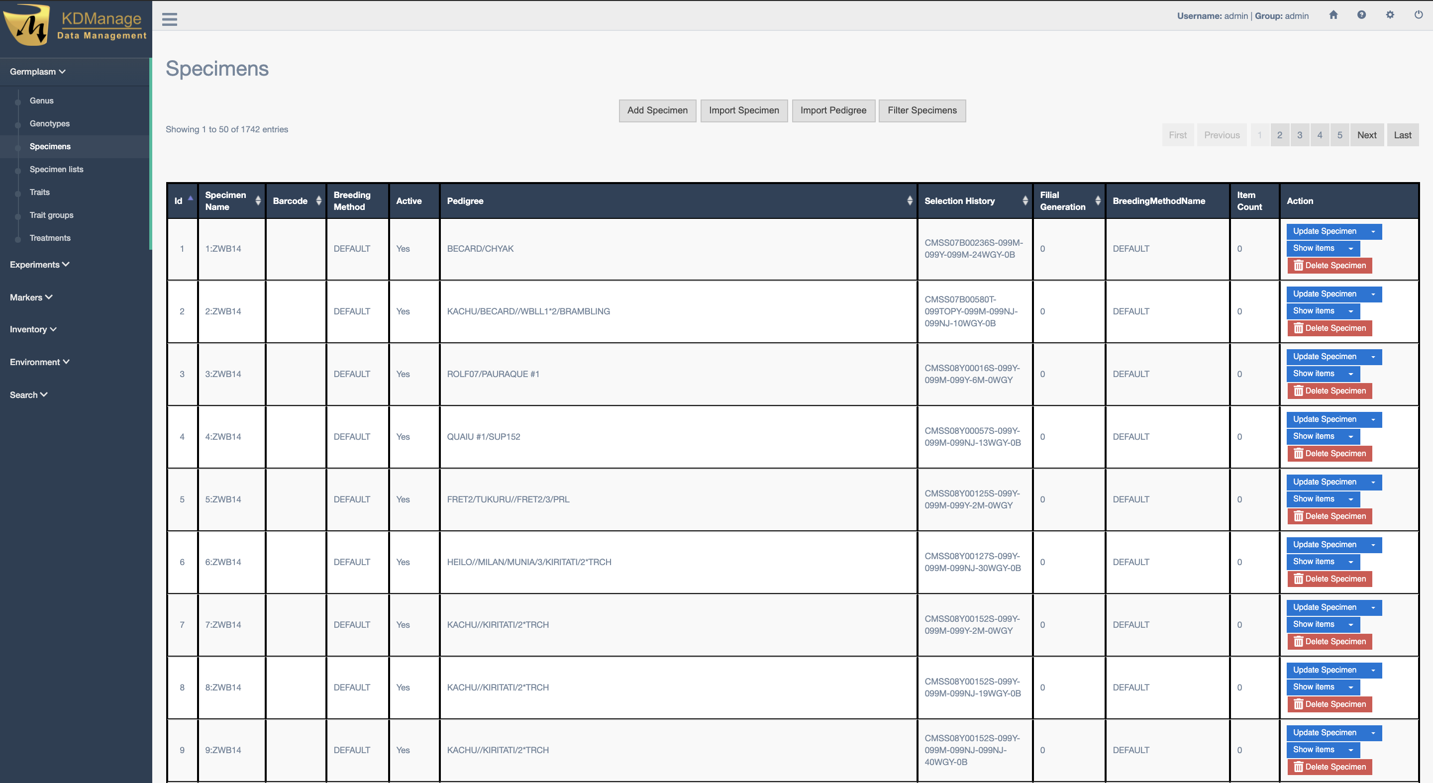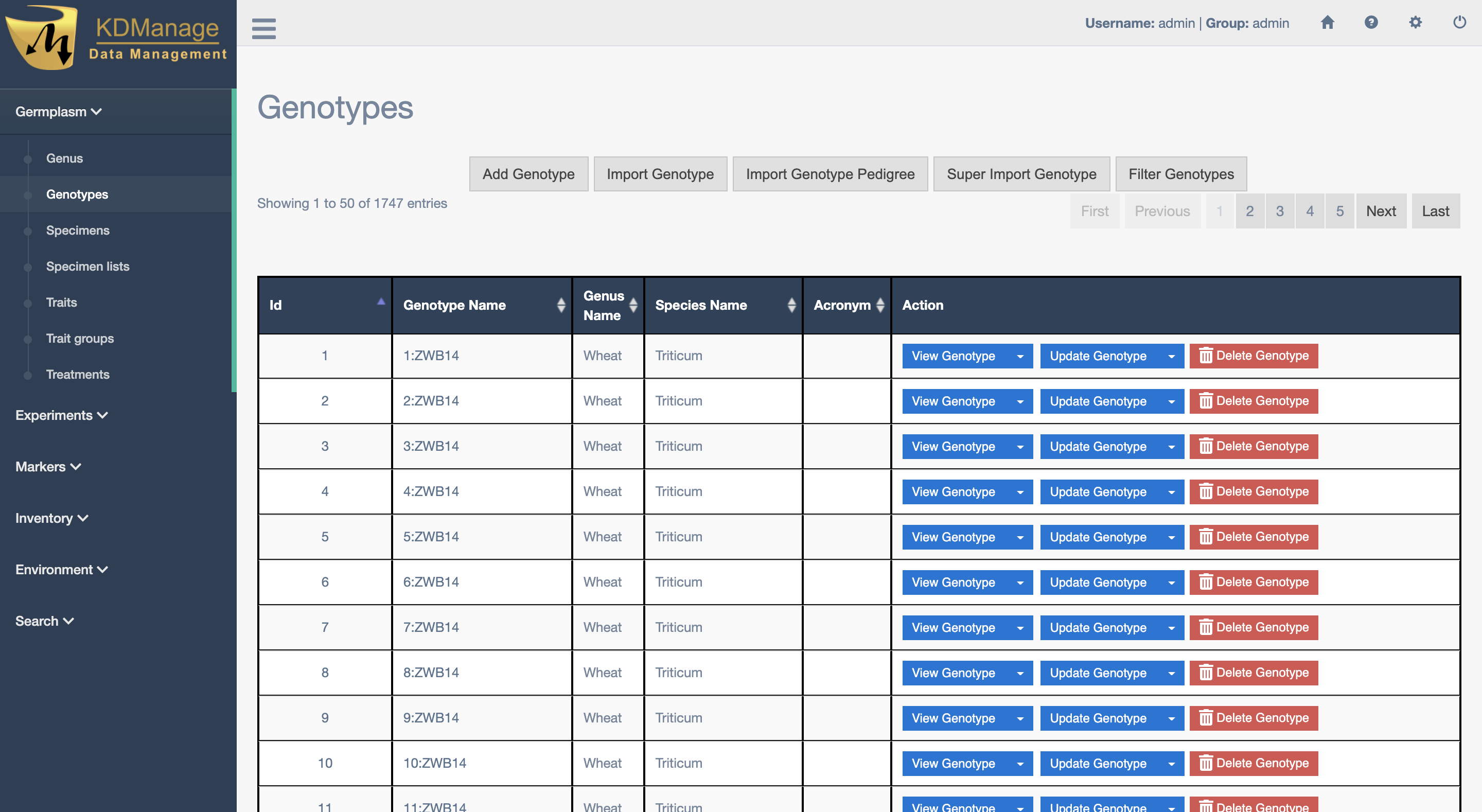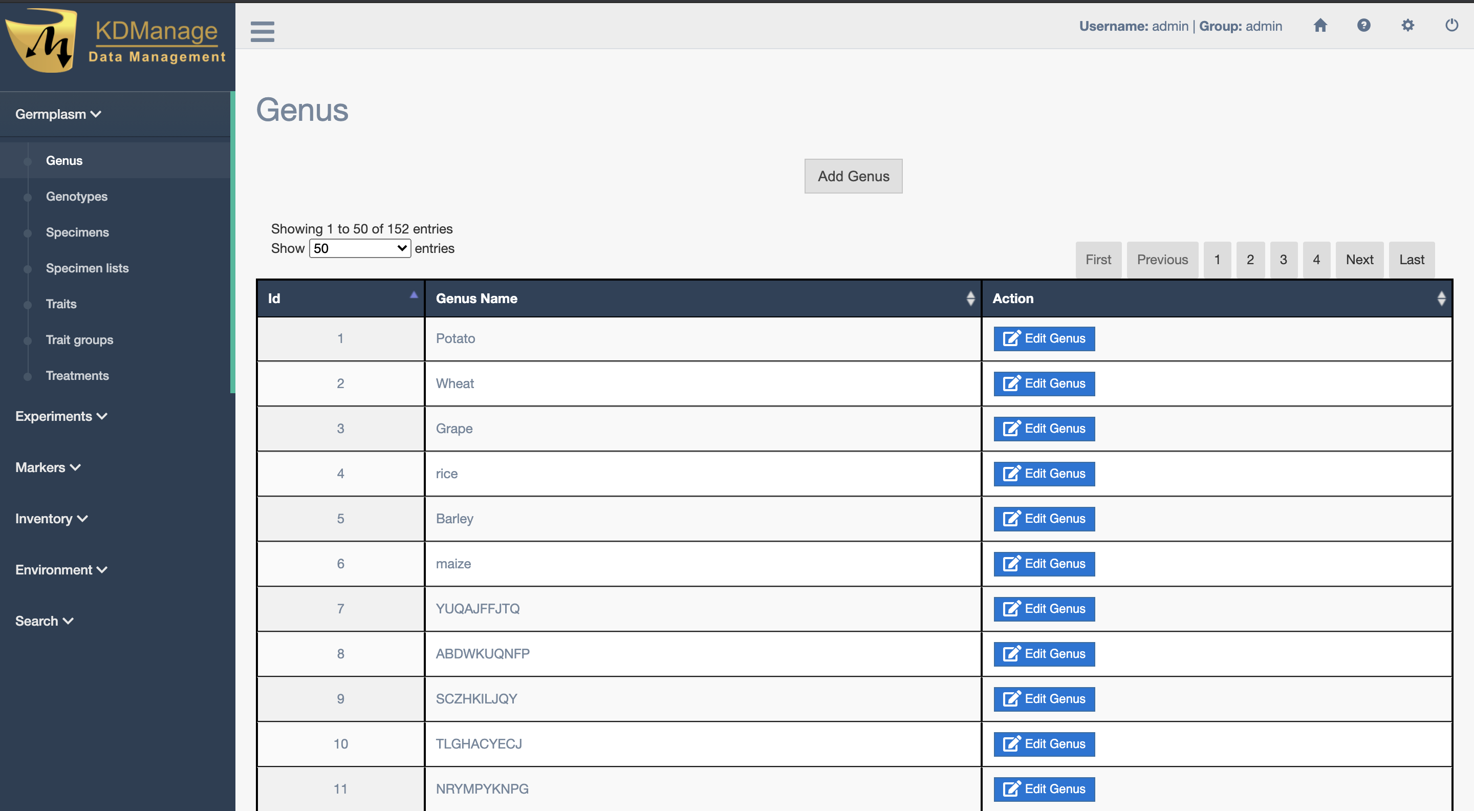 Genotype refers to the set of an individual’s genes. Each genotype in KDManage is listed in the Genotypes Page. A synonym for genotype can be variety and should be used as a generic category. As stated in the order of dependency, each genotype must be associated with a genus.