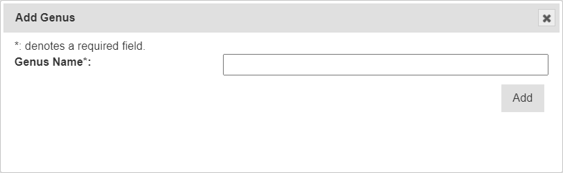 A new genus can be added to KDDart by selecting the Add Genus Button which displays the Add Genus Window as seen in the image below: