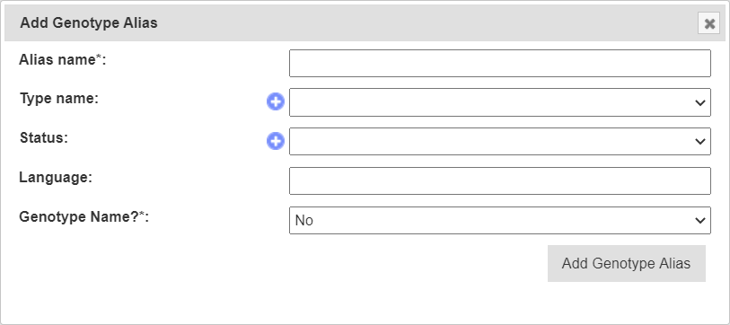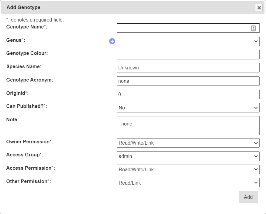 To add a genotype manually, select the Add Genotype Button on the Genotypes Page which will open the Add Genotype Window. The window and a table describing the fields for manual genotype addition can be seen below: