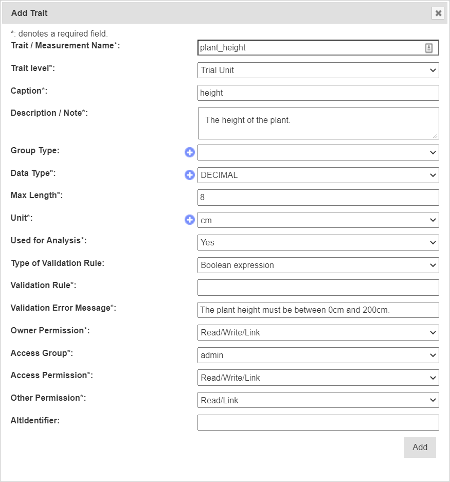 Traits are important descriptors of what is to be measured and what the permissible values are in those measurements. The Trait/Measurement Page enables the definition and quantification of a trait or characteristic of the trial/experiment. This includes a description and notes, the data type, units of measurement, maximum value and validation rule.