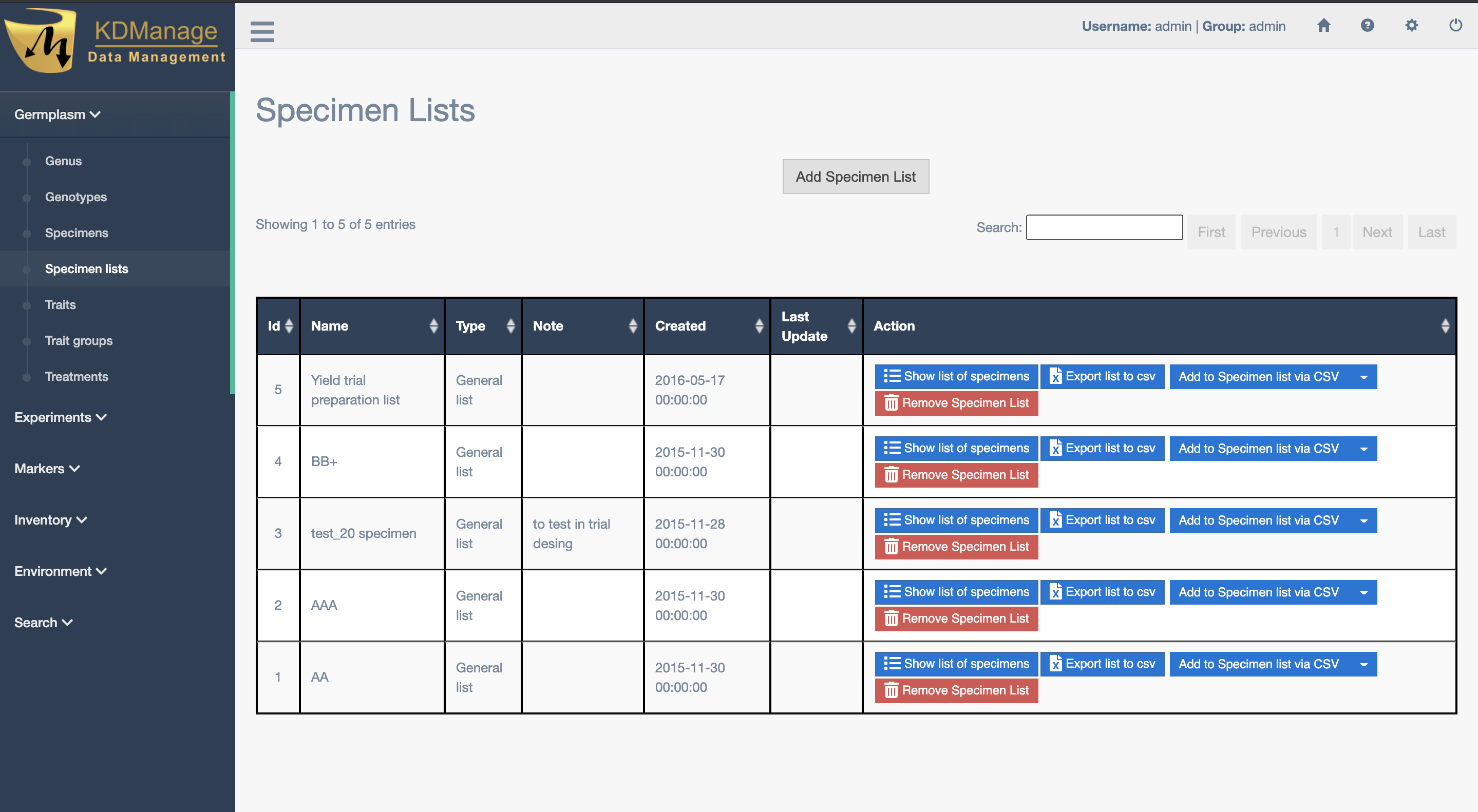 Specimens can be added to specimens lists for an organisation. The Specimen Lists Page can be seen in the image below: