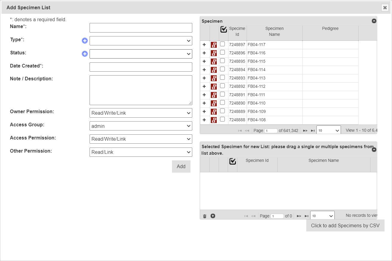 A new specimen list can be added by selecting the Add Specimen List Button which will display the Add Specimen List Window. The window and a table with the relevant fields can be found below: