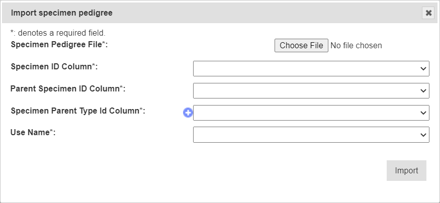 New pedigree entries for existing specimens can be imported by selecting the Import Pedigree Button which will display the Import Pedigree Window. The window is displayed below with a table that details the relevant fields: